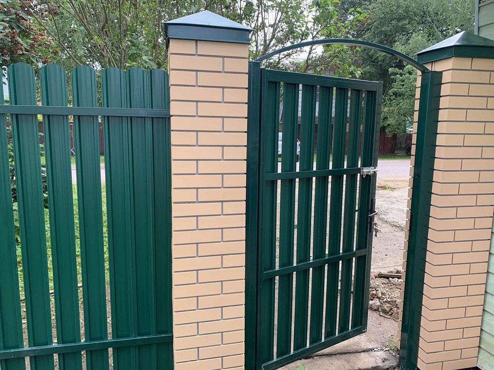 Установка кирпичных столбов вместе с забором не только отличное дизайнерское решение, но и способ продлить срок службы всему ограждению. Благодаря бетонному основанию и крепости конструкции столбы не дают металлу окислиться и проржаветь.