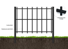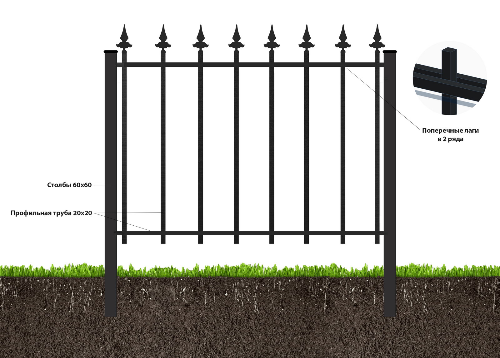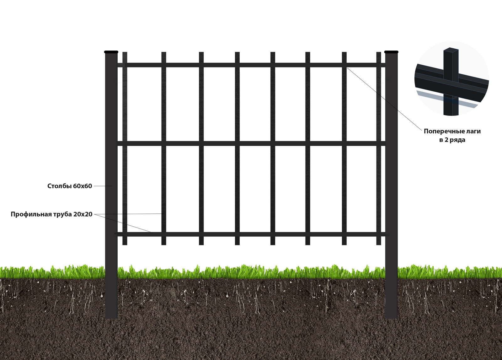 - Материал для секций. Каркас сварного забора изготавливается из профильной трубы 40х20 мм. В качестве заполнителя и для лаг используется металлическая профтруба 20х20х1,5 мм, которая может быть приварена с одной или с двух сторон от вертикальных планок.